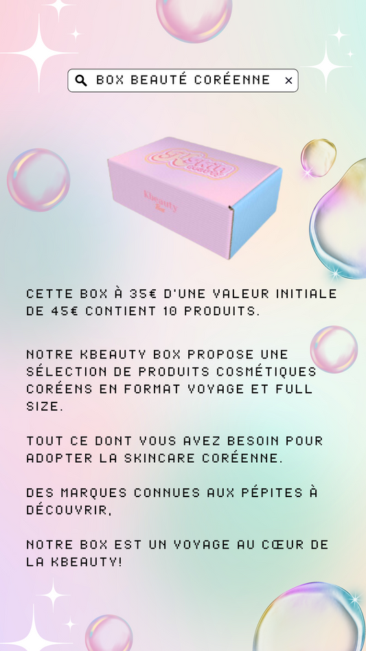 Chaque box découverte contient une sélection de produits en mini format et en full size, pour te permettre de tester et de découvrir une gamme complète de produits de Kbeauty. Des nettoyants doux aux masques nourrissants, en passant par les sérums hydratants et les crèmes nourrissantes, nos coffrets sont une véritable mine d'or de produits de qualité.
